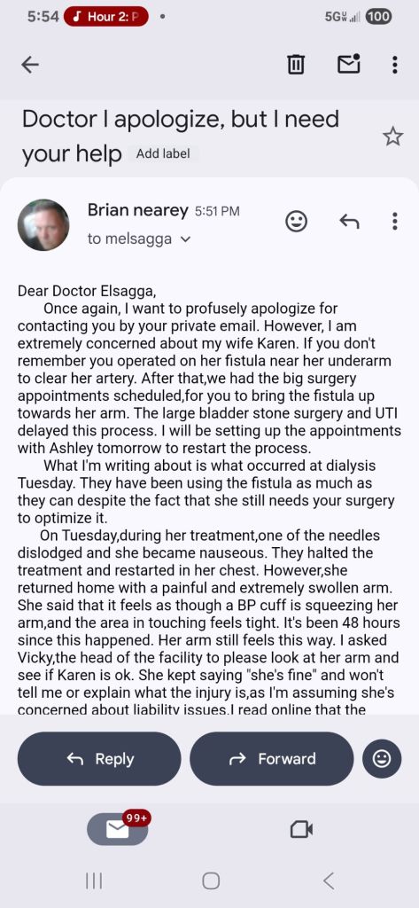 Anyway, yes,while Karen had a positive outcome with the surgery,we are immediately going to the next chapter. Karen’s next surgery on her arm. The fistula has to be corrected once and for all. If it isn’t,we will have an extremely precarious situation. As long as she has the chest catheter, there is a chance of infection and more trauma.