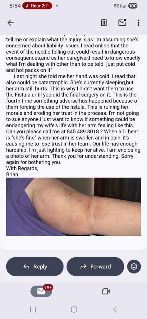 This afternoon, we are traveling to St Luke’s Cornwall Hospital in Newburgh NY to see Karen’s vascular surgeon to have an ultrasound to determine the severity of the injury she suffered at dialysis last Tuesday. It does indeed look worse,not better. The results of that I’ll write and post as it happens today. You’ll see the photo of her arm here.