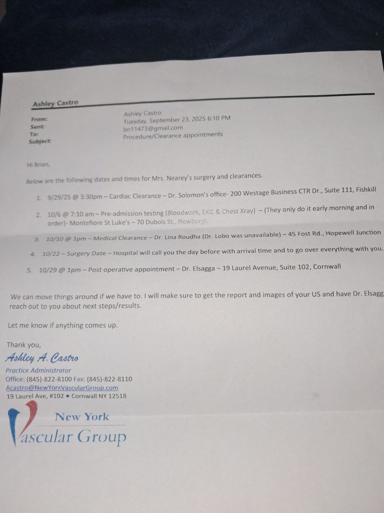 That’s it for part 1. You’ll see part 2 tomorrow. As far as asking for help, we just have to survive until Thursday night/Friday morning at 1AM,when we get paid. After that, we are standing on our own,no matter what. I’ll discuss that in more detail later as well. Please wish us well with the vascular surgeon. Talk to you later,thank you for everything.