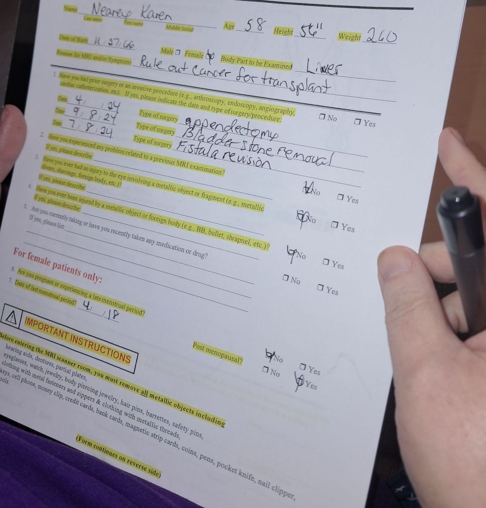 We also on Wednesday traveled to Westchester Medical Center Radiology for Karen’s Liver Transplant Clearance MRI. We will be meeting with their team again in about 2 weeks to find out if she’ll be indeed placed on the list. We don’t know if they’ll say yes,it’s a tribunal of professionals that make that decision. I’ll write more details on that in the next part.