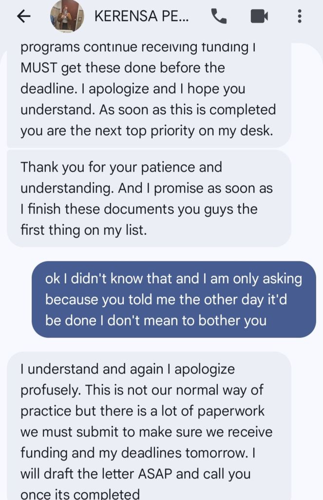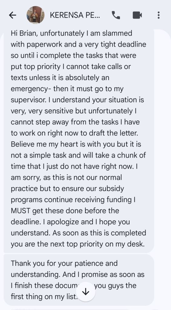 As I stated a couple of weeks ago,we picked out a place that we’d like to move into. People USA have indeed accepted us into their housing program. The place that we picked out will be a perfect apartment for us. The landlord,however,has not received the paperwork from the agency that he needs to allow us to sign the  lease and move in. We’ve been told by the housing coordinator that HUD is involved in paying the first months rent and security. I was told on Tuesday the paperwork would be emailed to us (and the landlord) on Wednesday. Now I believe the government shutdown is affecting this somewhat. I am showing the text exchange I was involved in on Thursday with the housing coordinator. I can’t fathom having yet another delay,another letdown,another broken promise.
